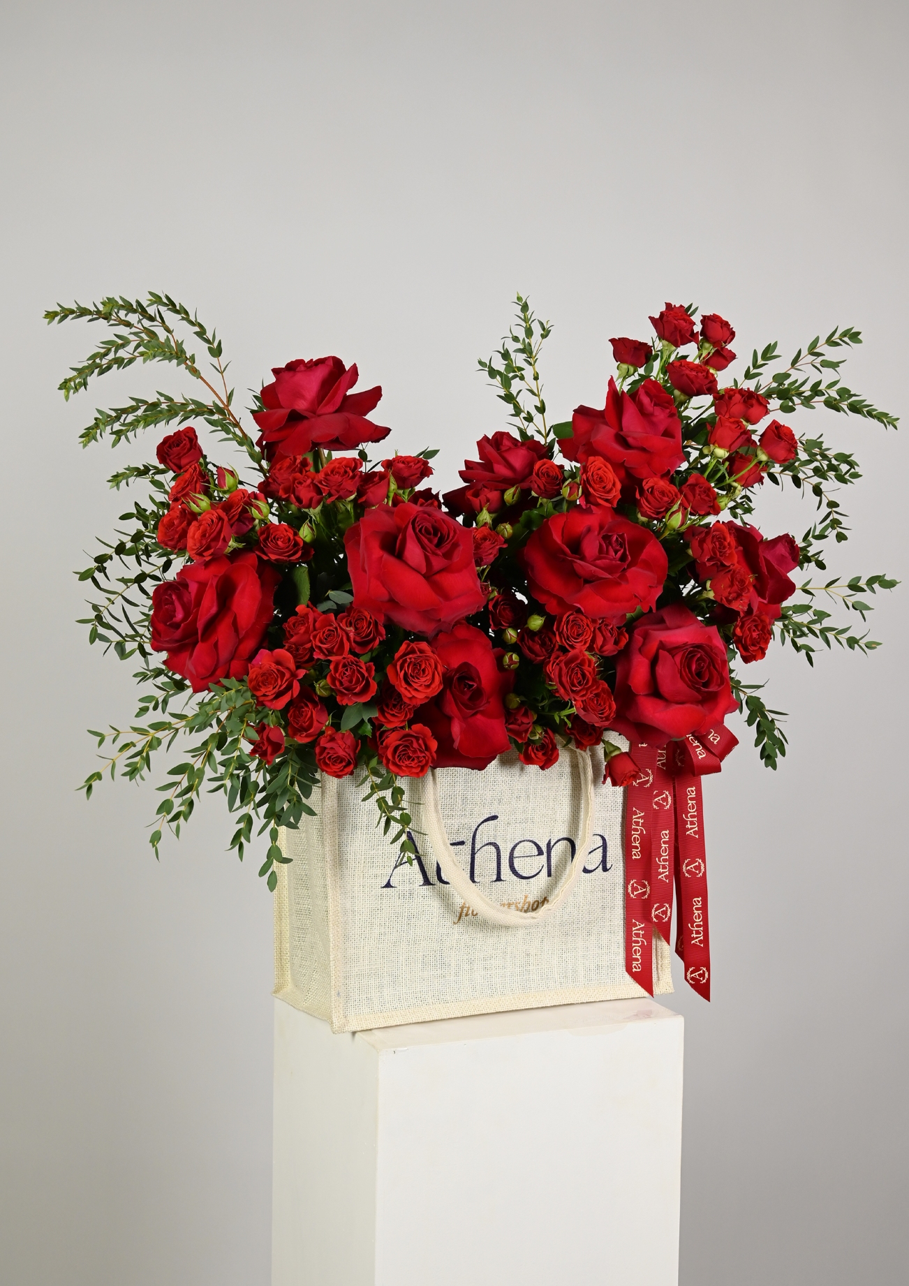 A luxurious floral arrangement presented in an elegant straw bag, featuring a harmonious blend of soft pink and peach roses, accented with delicate purple blooms and fresh eucalyptus foliage. A refined design, perfect for stylish gifting and special occasions.